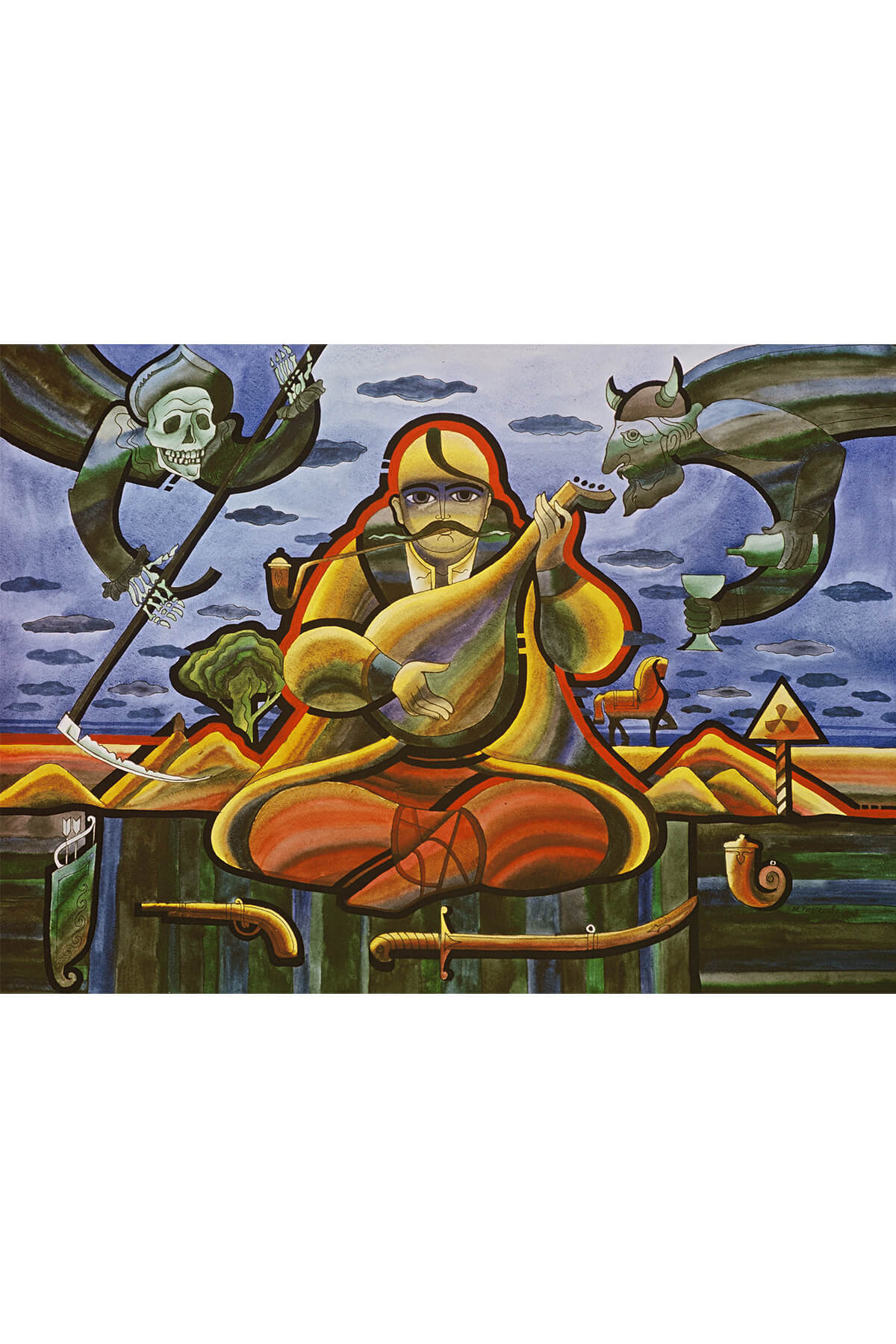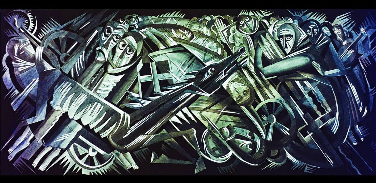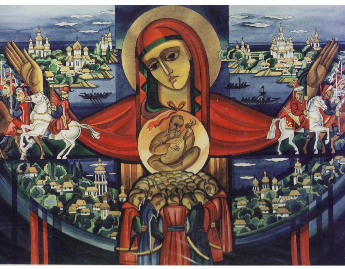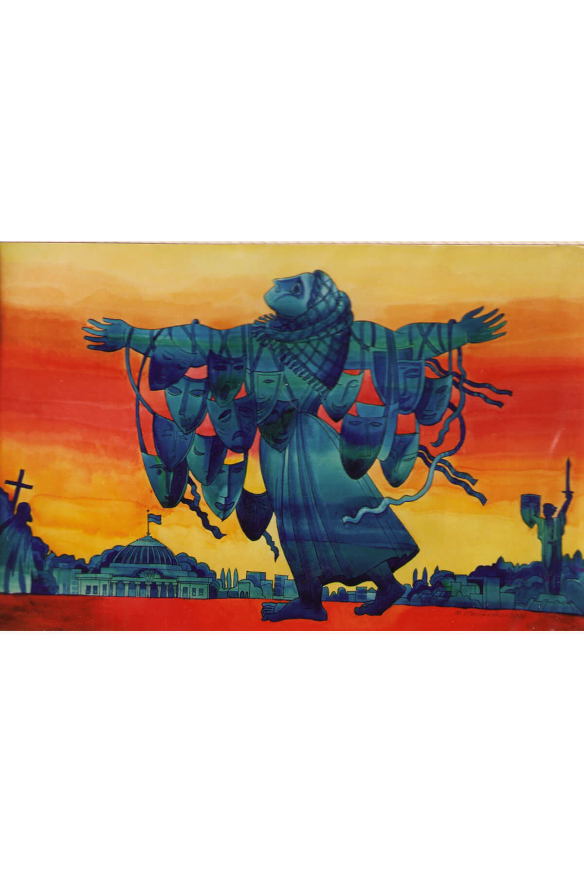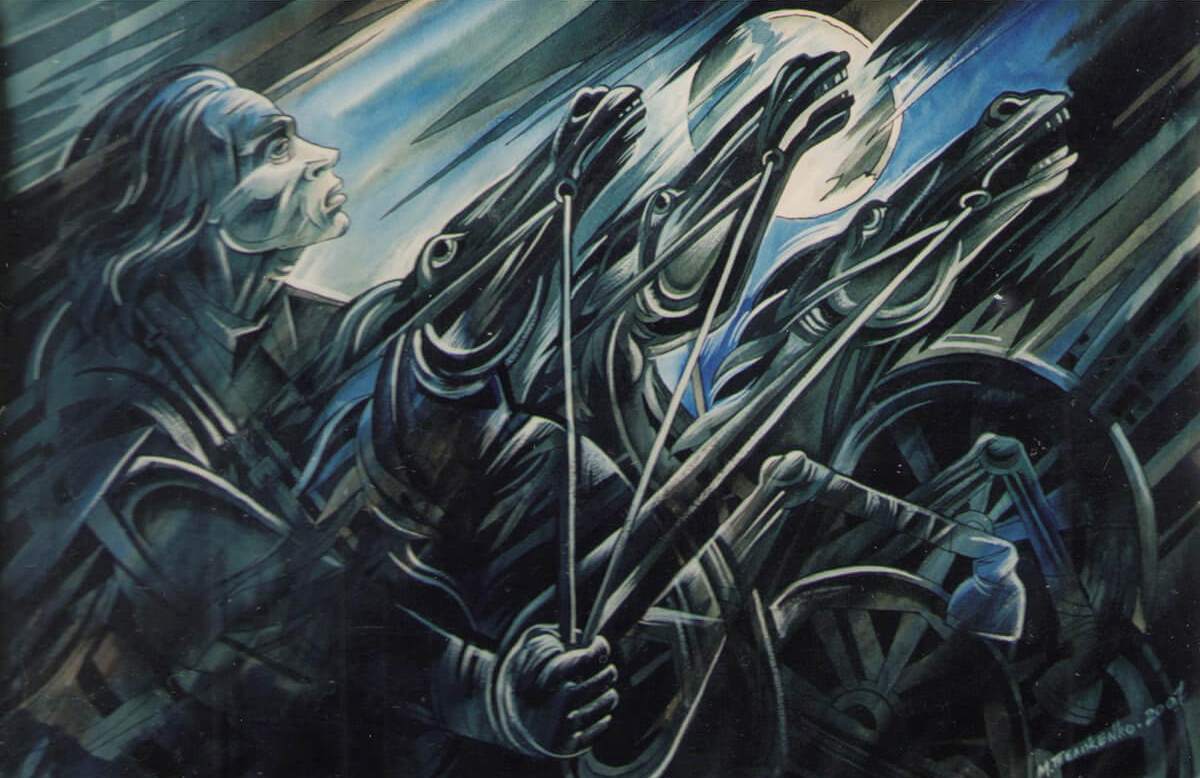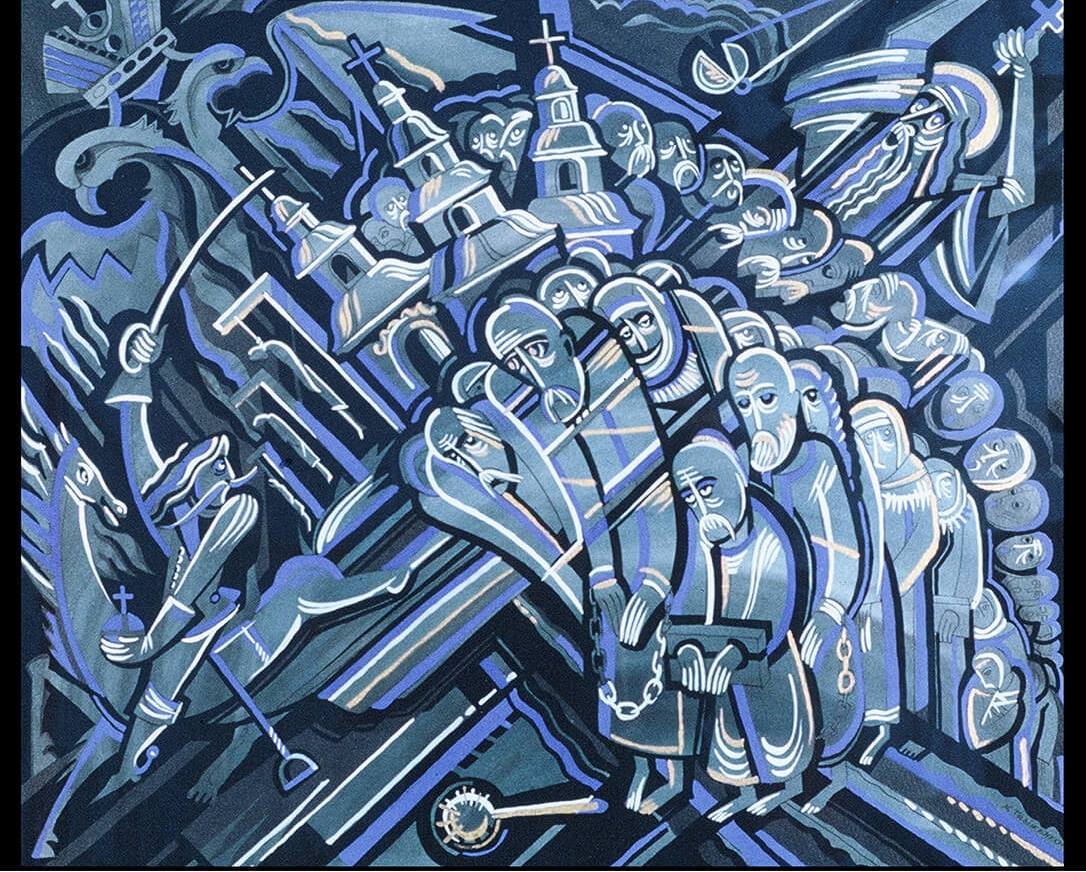 Такий же експресивно-трагічний "Голодомор", "Голгофа України (Калнишевський)", "Георгій-змієборець". Побудова картини діагонально-динамічна без будь-якого натяку на статику. "Колісниця Нестора" нагадує вихор. Лінії рішучі й суворі, колорит трагічно-темний із відблисками темно-синіх, сірих ліній-блискавиць. І лише "Золотий Мамай", присвячений пам'яті В'ячеслава Чорновола, утихомирює бунтівний характер художника.