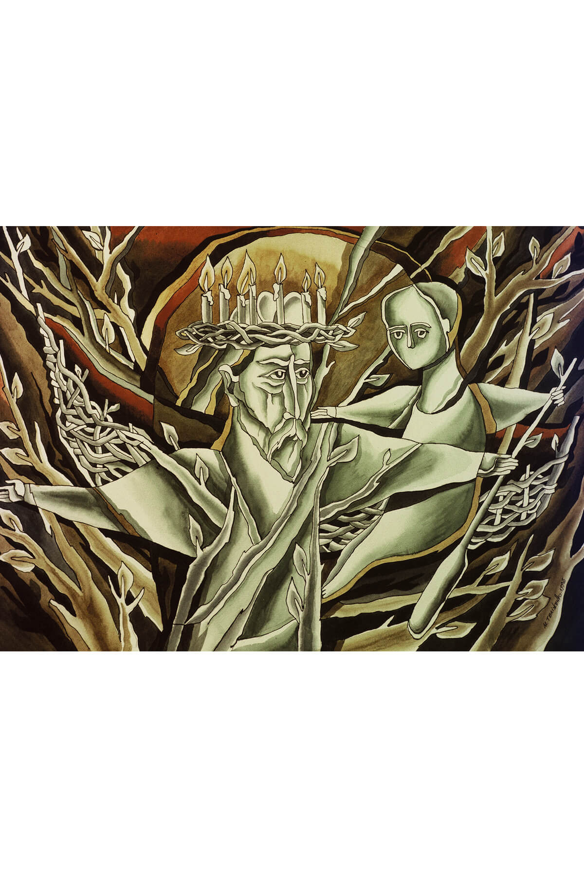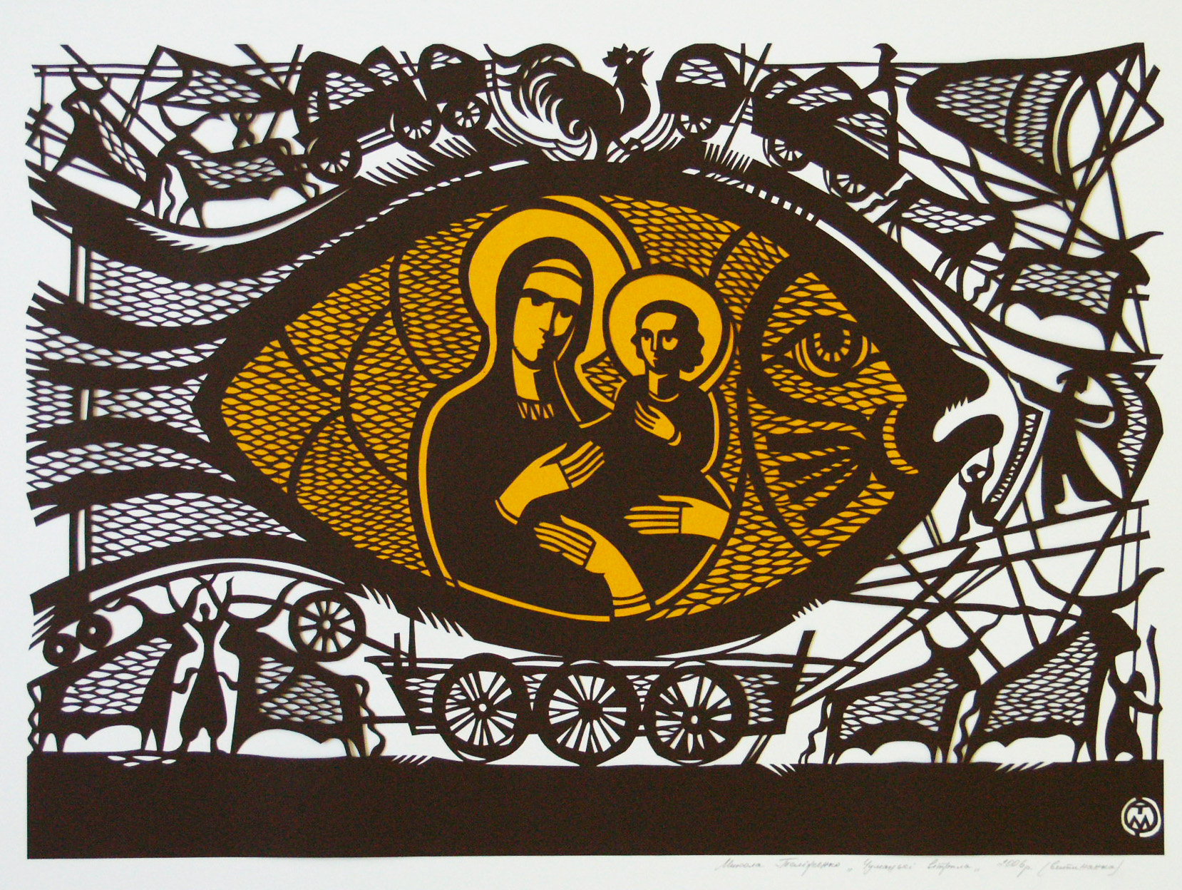 Діагонально-схрещена композиція "Анафема" – не менш трагічна. У динамічній деформації трикупольна церква. Біля неї шибениці. Зліва вискакує вершник із шаблею, а на діагоналі зверху – священик із хрестом виголошує анафему Мазепі над головами скованого, знедоленого люду.